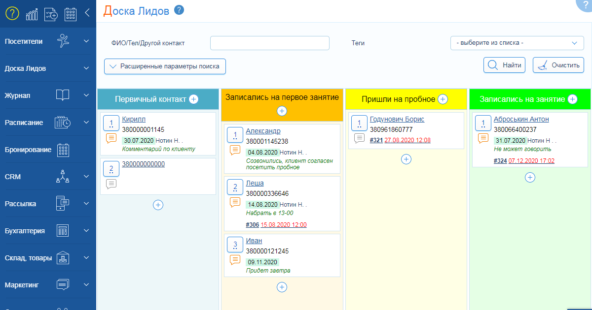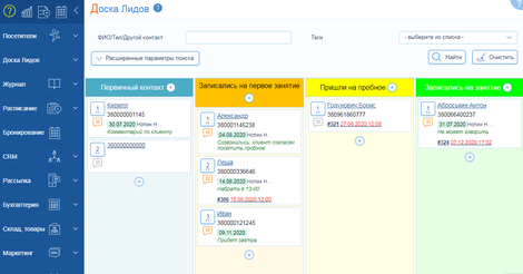 - Налаштуйте і використовуйте автоматичні дії: автоматичну розсилку, зміну статусу або створення завдання по клієнту в залежності від різних подій (закінчення абонемента, відвідування пробного заняття та ін.).