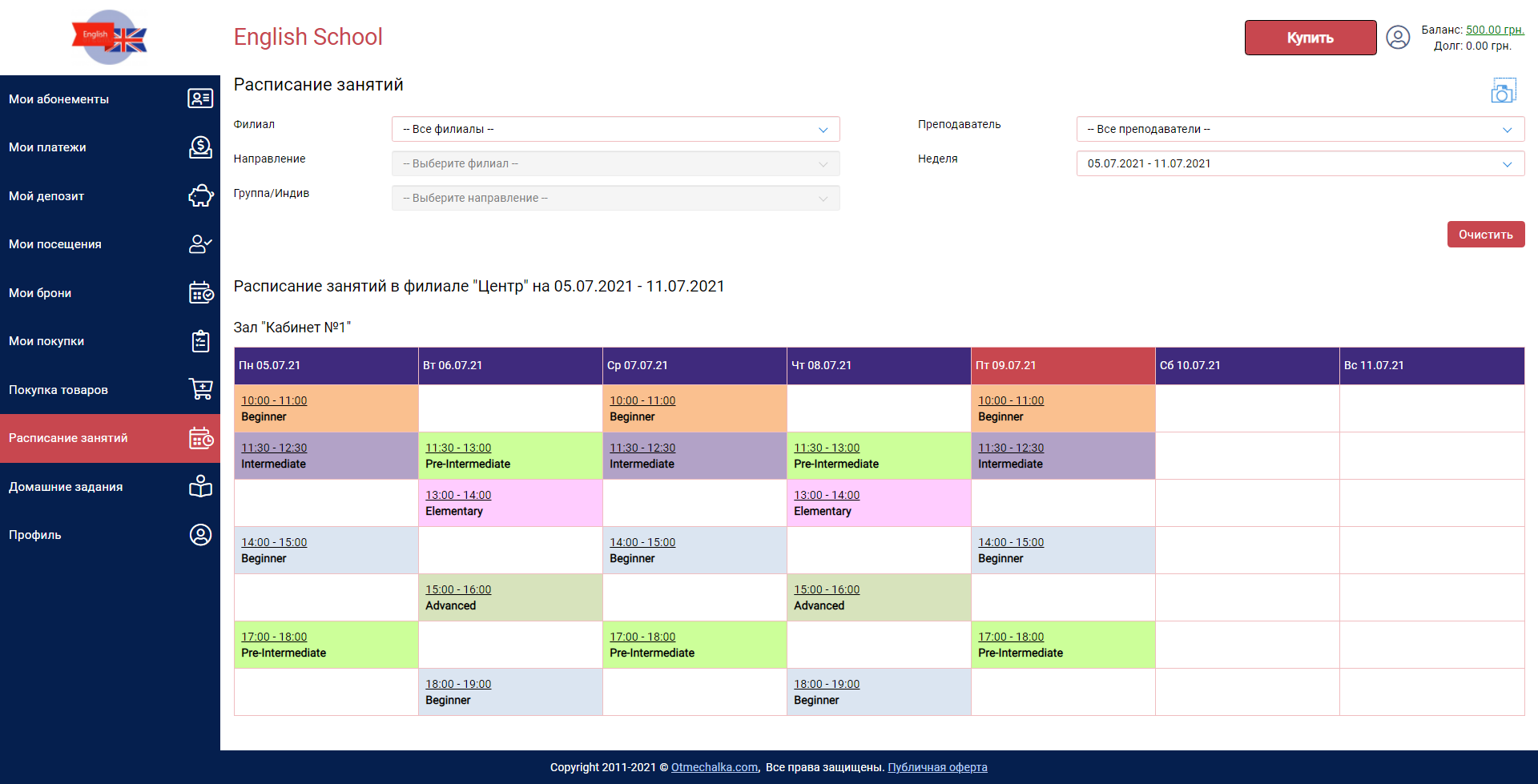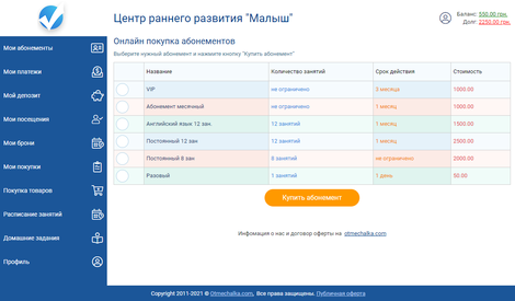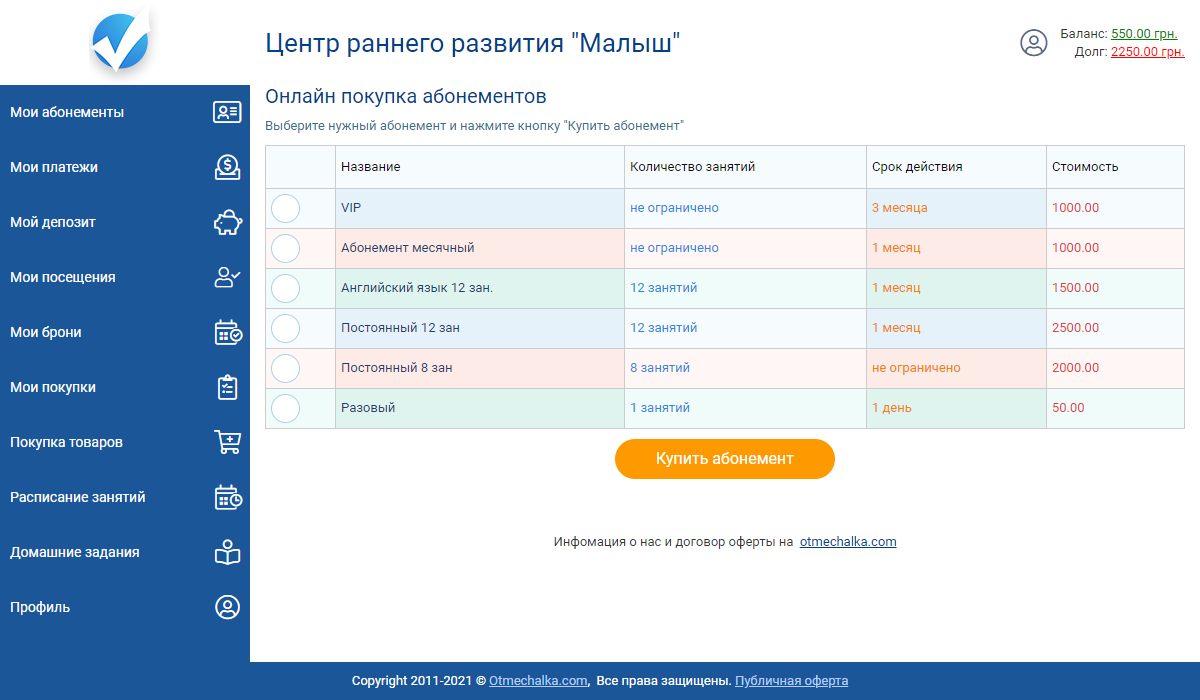 Крім того, Ви отримаєте персональний особистий кабінет для кожного клієнта, в якому клієнт зможе не тільки купити абонемент, товар, погасити борг і поповнити депозит, а й отримати інформацію про дату закінчення абонементів, кількості залишилися занять, історії відвідувань, покупок, а також зможе самостійно записатися на заняття або скасувати запис.